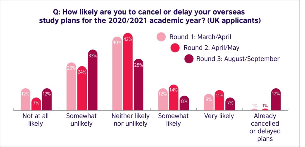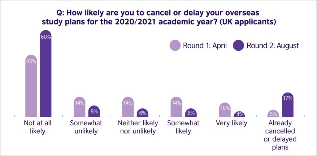 Although the start of the autumn term was just around the corner when we launched the survey, Chinese respondents showed a high level of uncertainty, with 28% saying that they were ‘neither likely nor unlikely’ to cancel or delay their overseas study plans. That’s lower than the 40% to 42% we saw in our previous two surveys, but still high for so late in the cycle. Moreover, if you combine the undecideds with those who are at least ‘somewhat likely’ to cancel, we can see the contours of a worst-case scenario in which around 55% could still decide to delay or cancel.