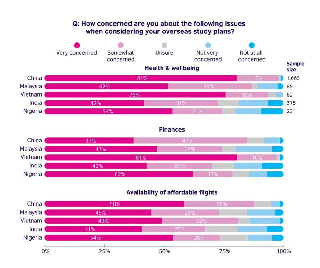 Across our surveys, we also asked respondents how concerned they were about several key issues when contemplating their study plans. In the midst of a pandemic, health and wellbeing unsurprisingly topped the list, though with significant differences across the various countries we polled. In China, where the virus appears to be all but eliminated, 81% of respondents said that they are ‘very concerned’ about health and wellbeing when evaluating their plans to study overseas. Aside from Vietnam, health concerns were somewhat softer in other major markets, but nonetheless a sizeable portion of respondents ticked the highest level of concern in almost every market we polled.