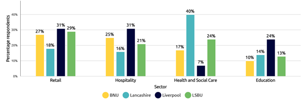 Our analysis highlights how the risks associated with paid work differ across institutions and how regional labour markets shape patterns of student employment. For instance, our survey indicates a higher proportion of students working in health and social care in Lancashire, where the sector represents 15% of total employment. In contrast, Liverpool’s relatively large share of hospitality student workers reflects the sector’s prominence, accounting for around 10% of jobs in the city region. These different contexts can help steer local interventions to reduce risk associated with particular sectors.