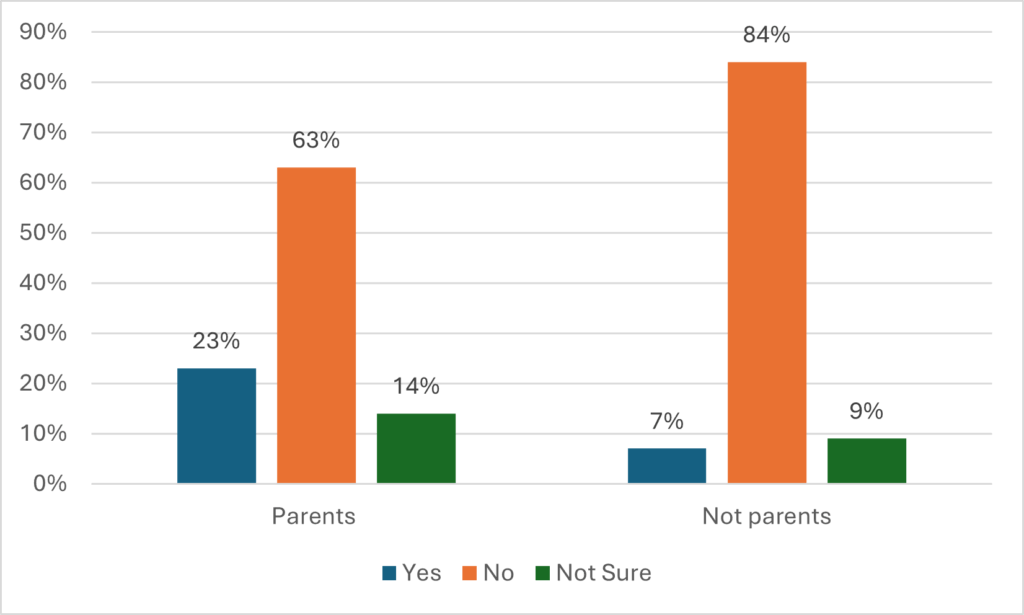 The data could also be analysed by parental status. The definition of ‘parent’ in this survey is anyone with a child under the age of 18. Figure 3 shows that almost a quarter of parents (23%) are aware of the LLE, compared to only 7% of those who are not parents. There is an overlap with the responses by age.