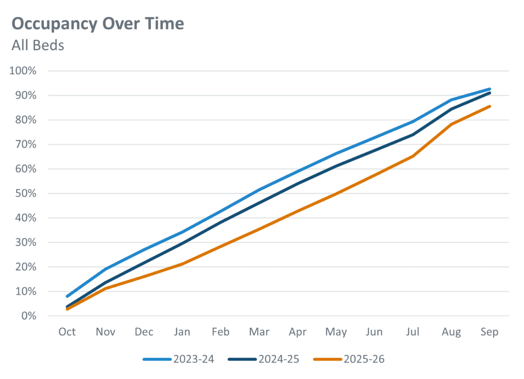 Demand for PBSA has obviously dropped, with very few accommodation shortages now being reported and many surpluses with an increase in empty rooms (known as voids). It is difficult to get accurate data on occupancy, but the StuRents Occupancy Update issued in October 2025 is likely to show fairly accurate occupancy in private sector PBSA for 2025-26. That showed a decline to 85.4% occupancy, down 5.4% year on year. In the pre-Covid era, many PBSA supplies budgeted for between 95%-98% occupancy. The latest figures for lettings for 2026-27 show that by November 2025, lettings were already slightly down on the previous year.