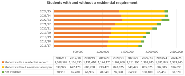 Concentrating on undergraduate entrants with and without a residential requirement 2016-25 the trend away from having a residential requirement is clear.