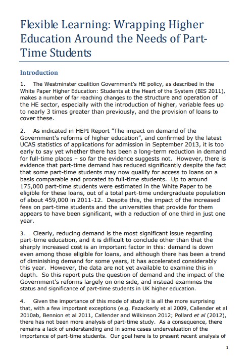This HEPI Report discusses the importance of part-time higher education, noting with concern the extent of the reduction in part-time student demand and also that the decline in demand has accelerated sharply this year, even among those part-time students eligible for loans. HEPI argues that not only is it likely that large numbers of part-time students have been put off study by the increased cost, but also that the measure that the Government put in place in the hope of offsetting the potentially off-putting impact of the cost increase has not been effective.