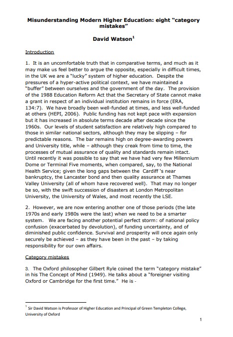 In this HEPI occasional report, Professor Sir David Watson discusses eight myths – category mistakes – concerning higher education that are widely believed, and argues that these need to be exploded if higher education is to maintain its current comparatively healthy state. This report is based on his presentation to a joint HEPI/HEA seminar at the House of Commons on 26 January 2012.