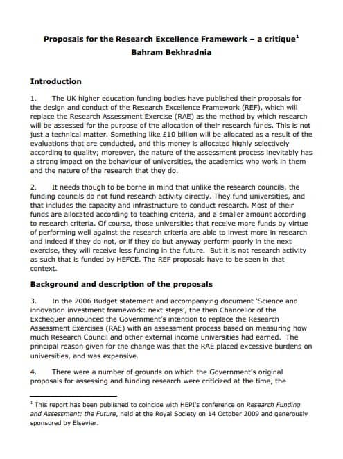 The UK higher education funding bodies have published their proposals for the design and conduct of the Research Excellence Framework (REF), which will replace the Research Assessment Exercise (RAE) as the method by which research will be assessed for the purpose of the allocation of their research funds. This paper is HEPI’s response to the proposals.