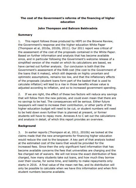 This report analyses the evidence of the cost of the Government’s reforms to the funding of higher education effective from this year.