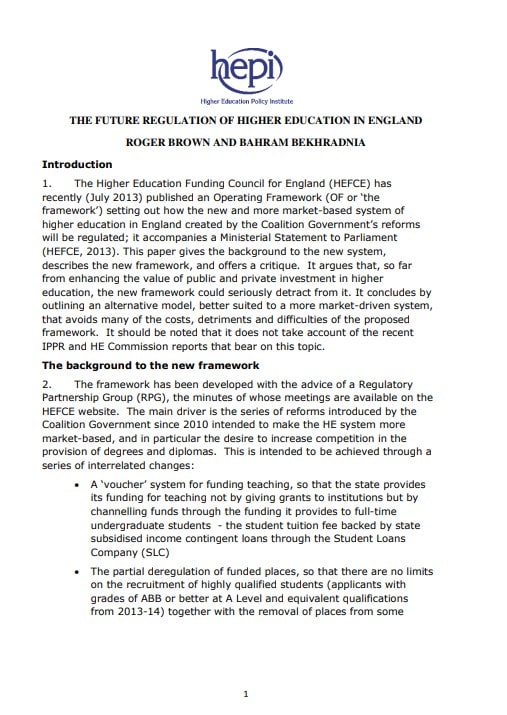 In a HEPI report examining the future regulation of higher education in England (published 7 November 2013) HEPI argues that in introducing its funding and other changes to the system of HE in England without securing a robust regulatory environment, the Government has left the sector vulnerable and itself unable to maintain the proper oversight needed to protect the public interest.