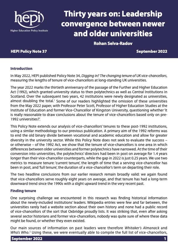 The year 2022 marks the thirtieth anniversary of the passage of the Further and Higher Education Act (1992), which granted university status to then polytechnics as well as Central Institutions in Scotland. Over the subsequent two years, 42 institutions were newly designated as universities, almost doubling the total.1 Some of our readers highlighted the omission of these universities from the May 2022 paper, with Professor Peter Scott, Professor of Higher Education Studies at the Institute of Education and former Vice-Chancellor of Kingston University, questioning whether ‘it is really reasonable to draw conclusions about the tenure of vice-chancellors based only on pre- 1992 universities?’.