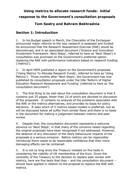 Using metrics to allocate research funds: initial response to the Government’s consultation proposals