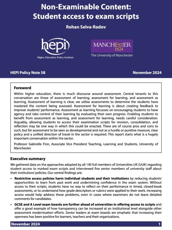Universities’ current policies on letting students access their marked exam scripts are harming individual students and institutions, according to a new report published today by the Higher Education Policy Institute…